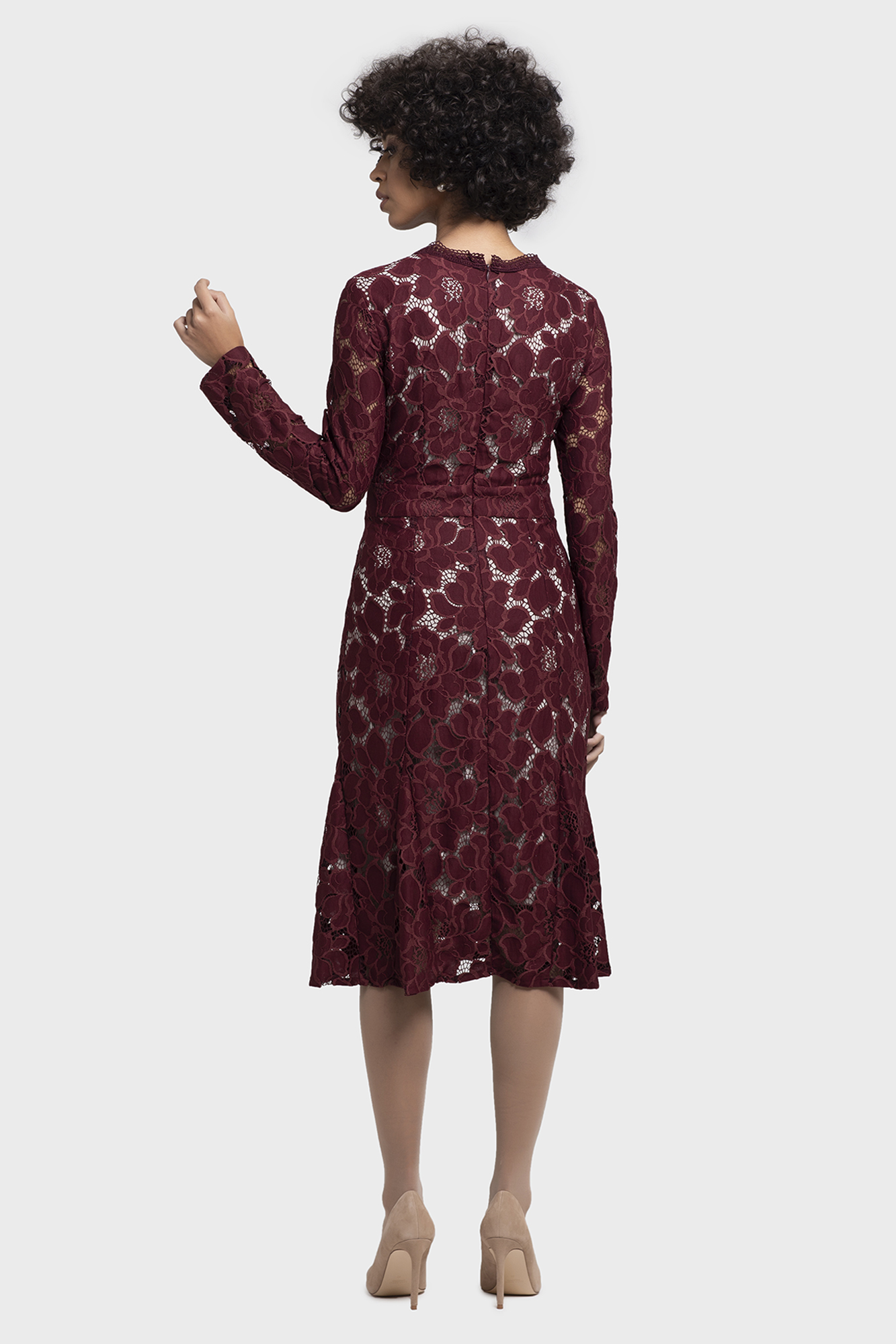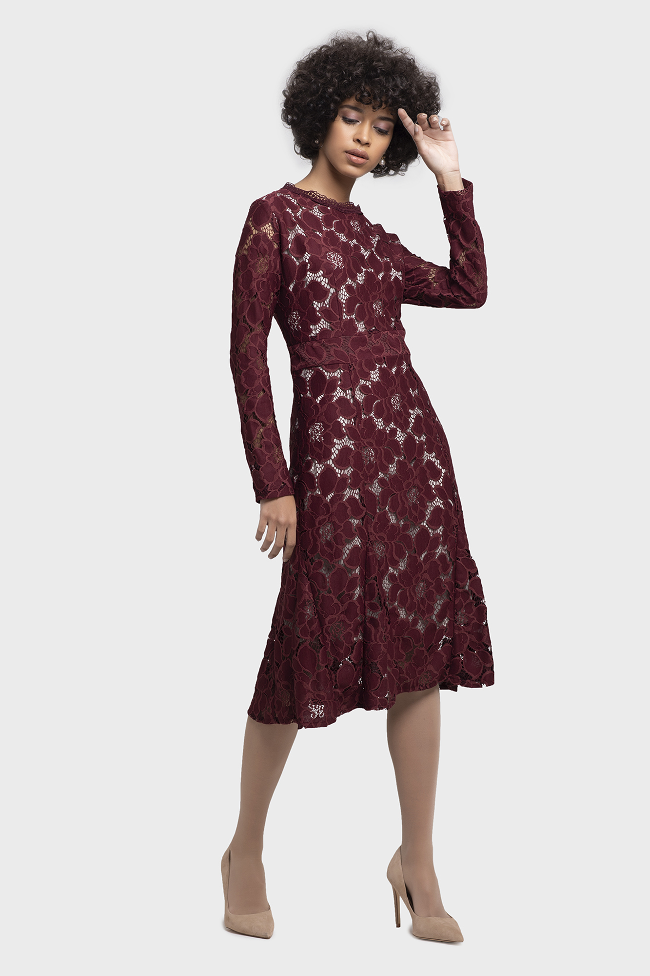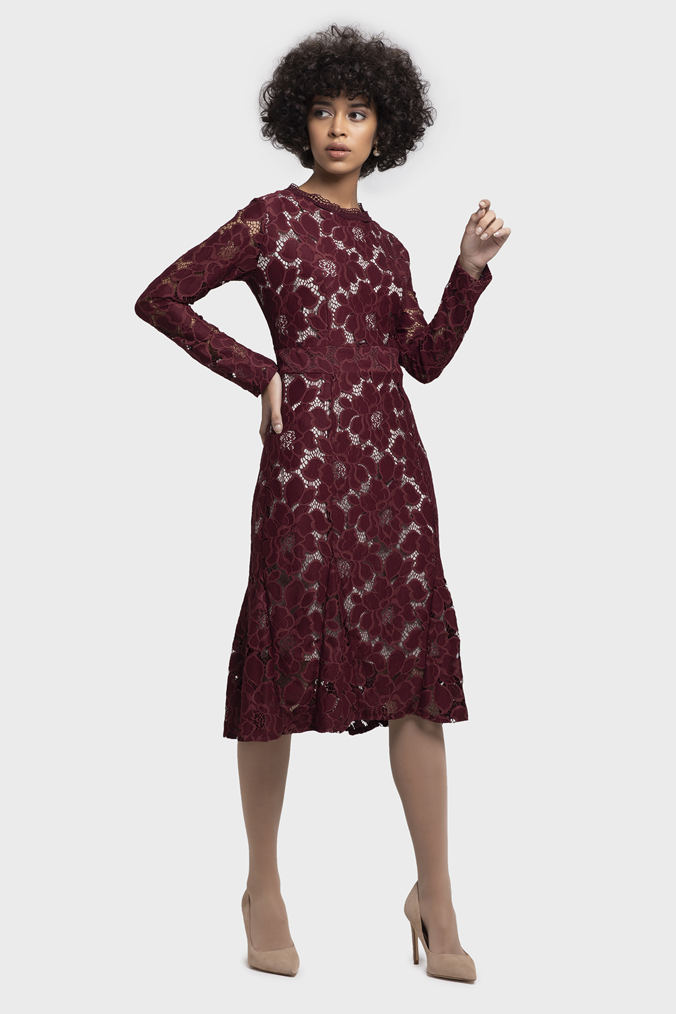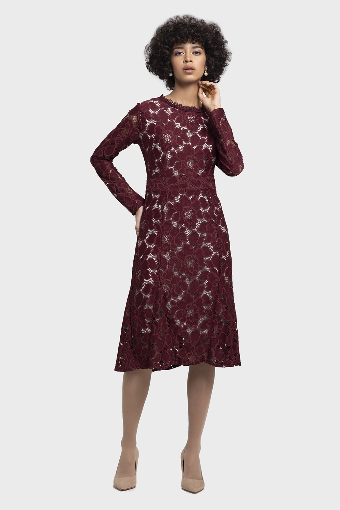 A timeless classic A-line lace dress with long over all lace sleeves, makes you fall in love with yourself. This enchanting dress falls gracefully forming an elegant silhouette making you look chic and sexy at the same time. Perfect as a power dress for office or after office occasions.