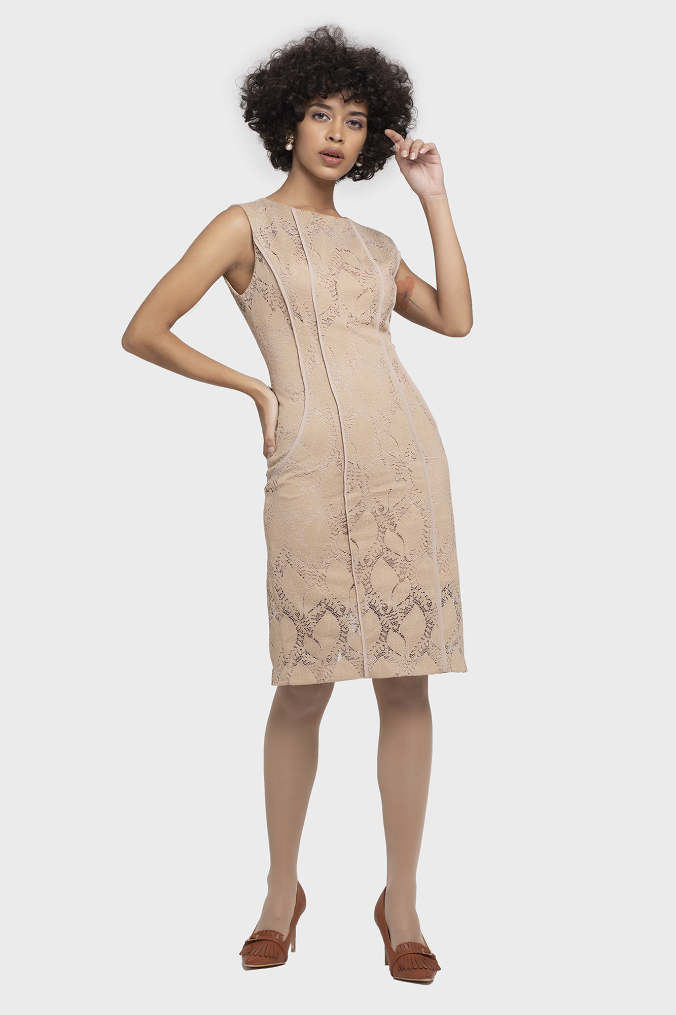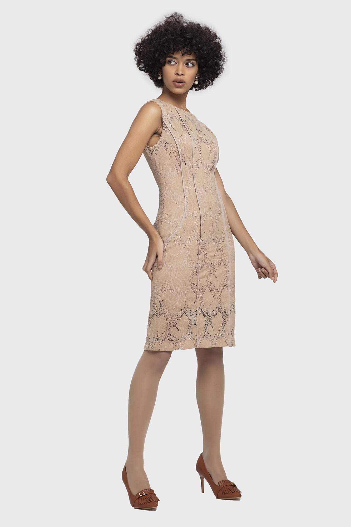 This dress is an elegant piece of fashionable lace fabric with a luxurious silhouette. The dress gives a feminine feeling with flawless design and sophisticated color finish. Starting with a round neck and lightly visible clavicle line with balanced bias detail giving you a feeling of slimline along with rich lace fabric.