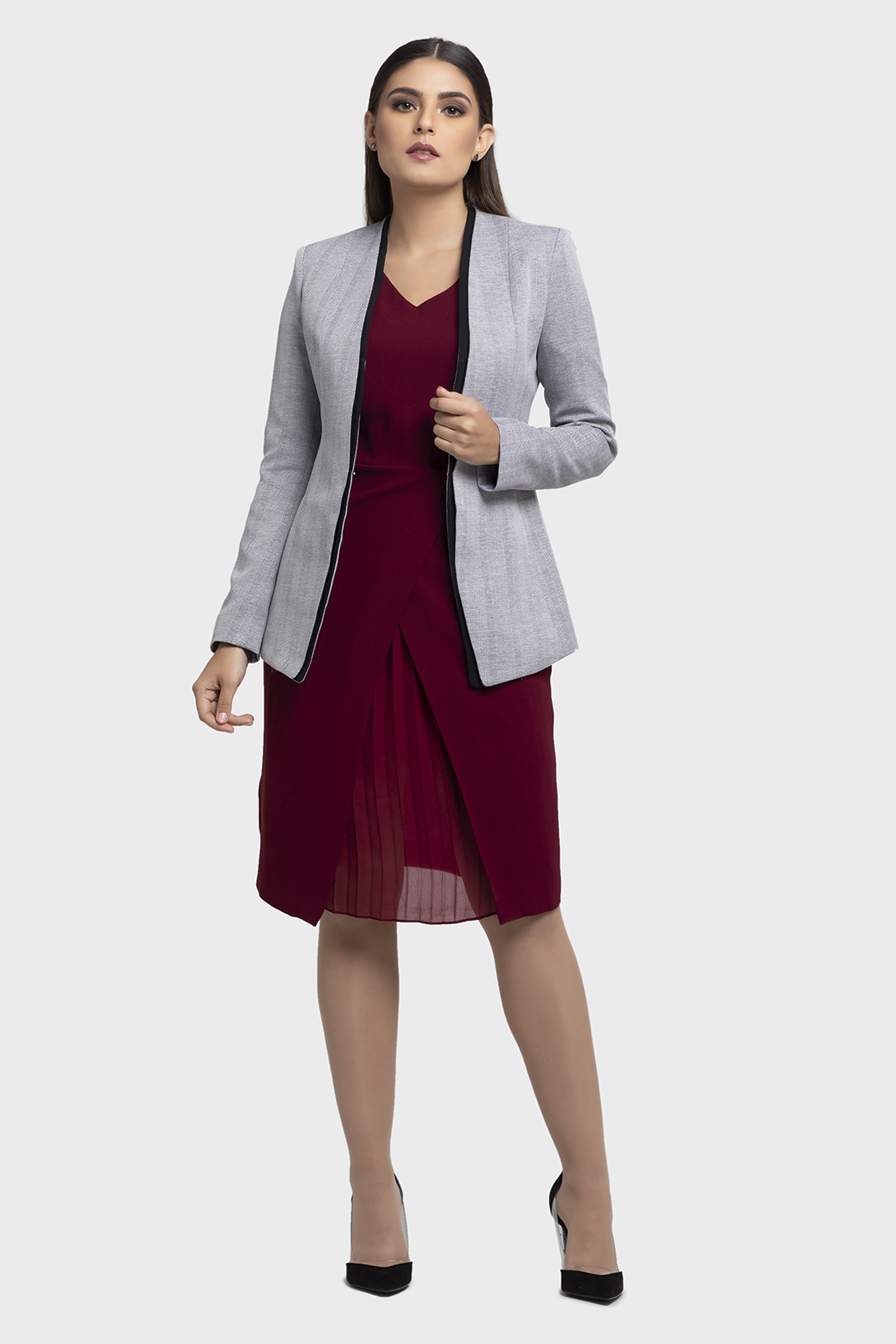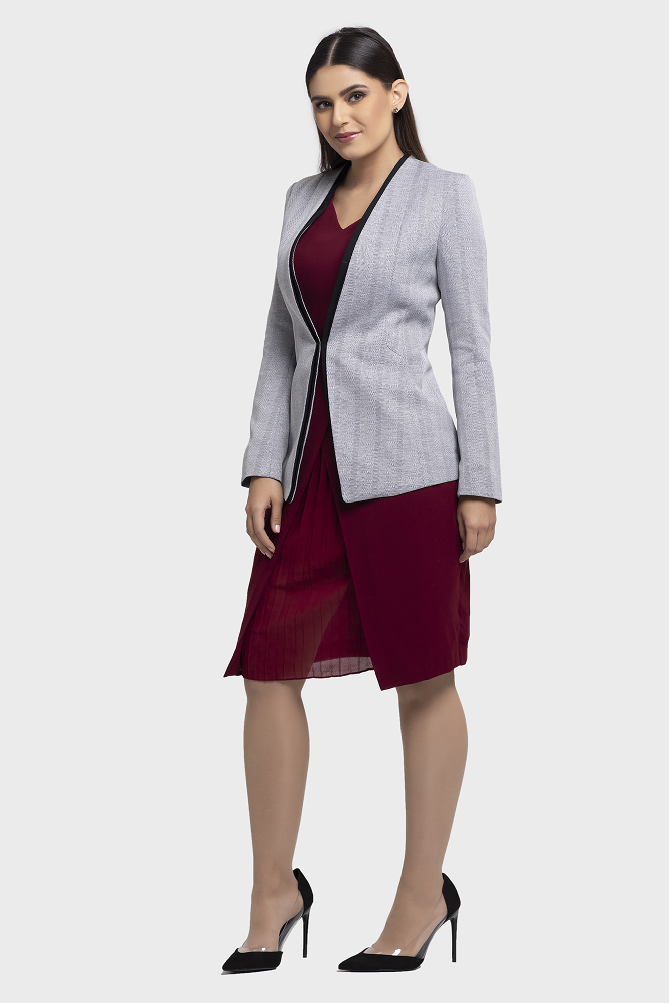 This elegant Jacket beautifully enhances the feminine silhouette. The neckline comes with a different color lapel falling till the end of the jacket.
