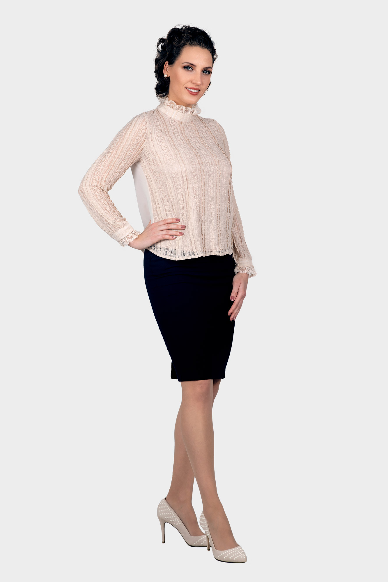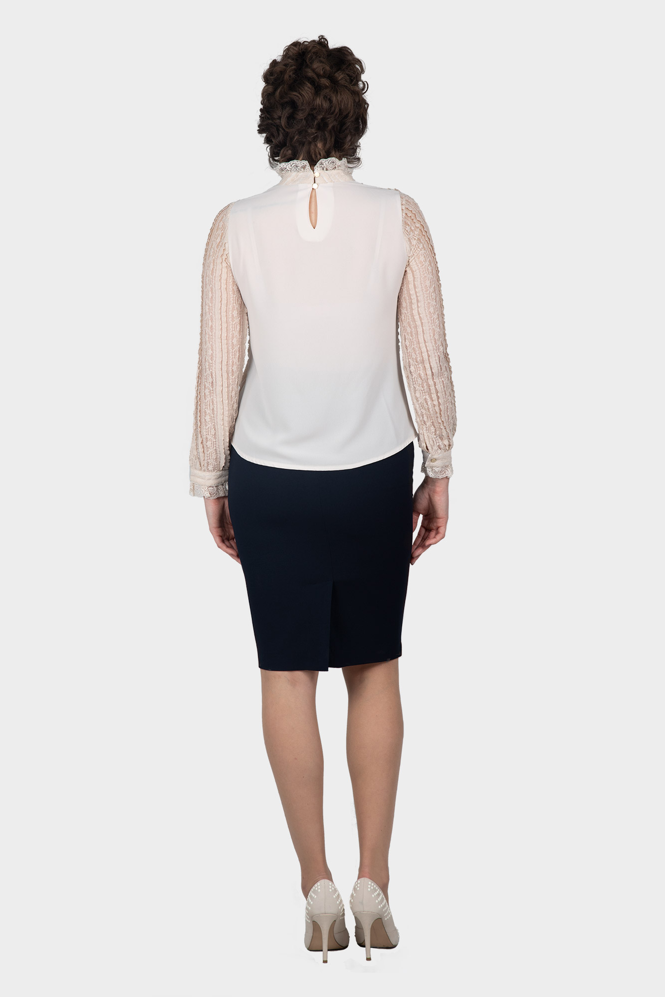 This long-sleeved blouse is designed with high neck frill lace which gently wraps the neckline, it holds the neckline thinner and more feminine. It’s completed with a front lining only, back part uses a thin poly fabric without lining, this blouse is sure to stand out.