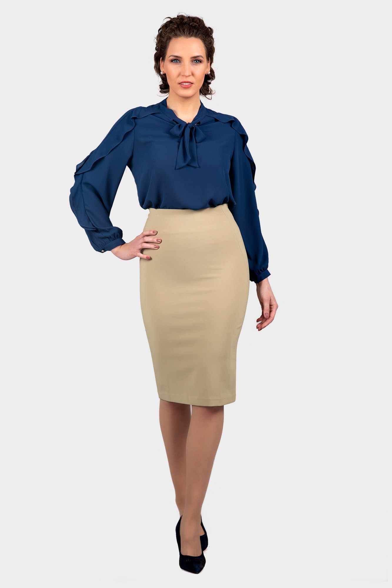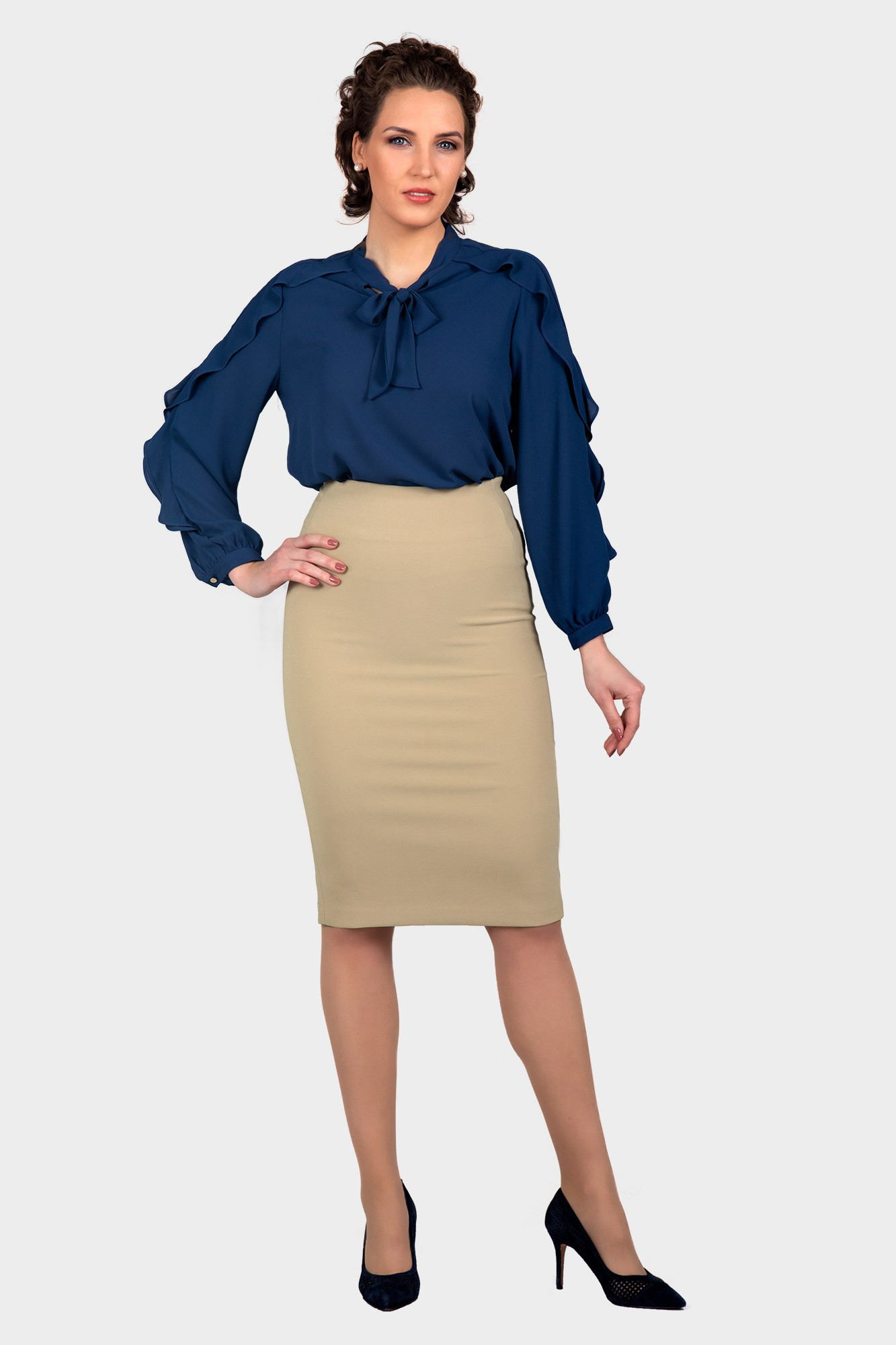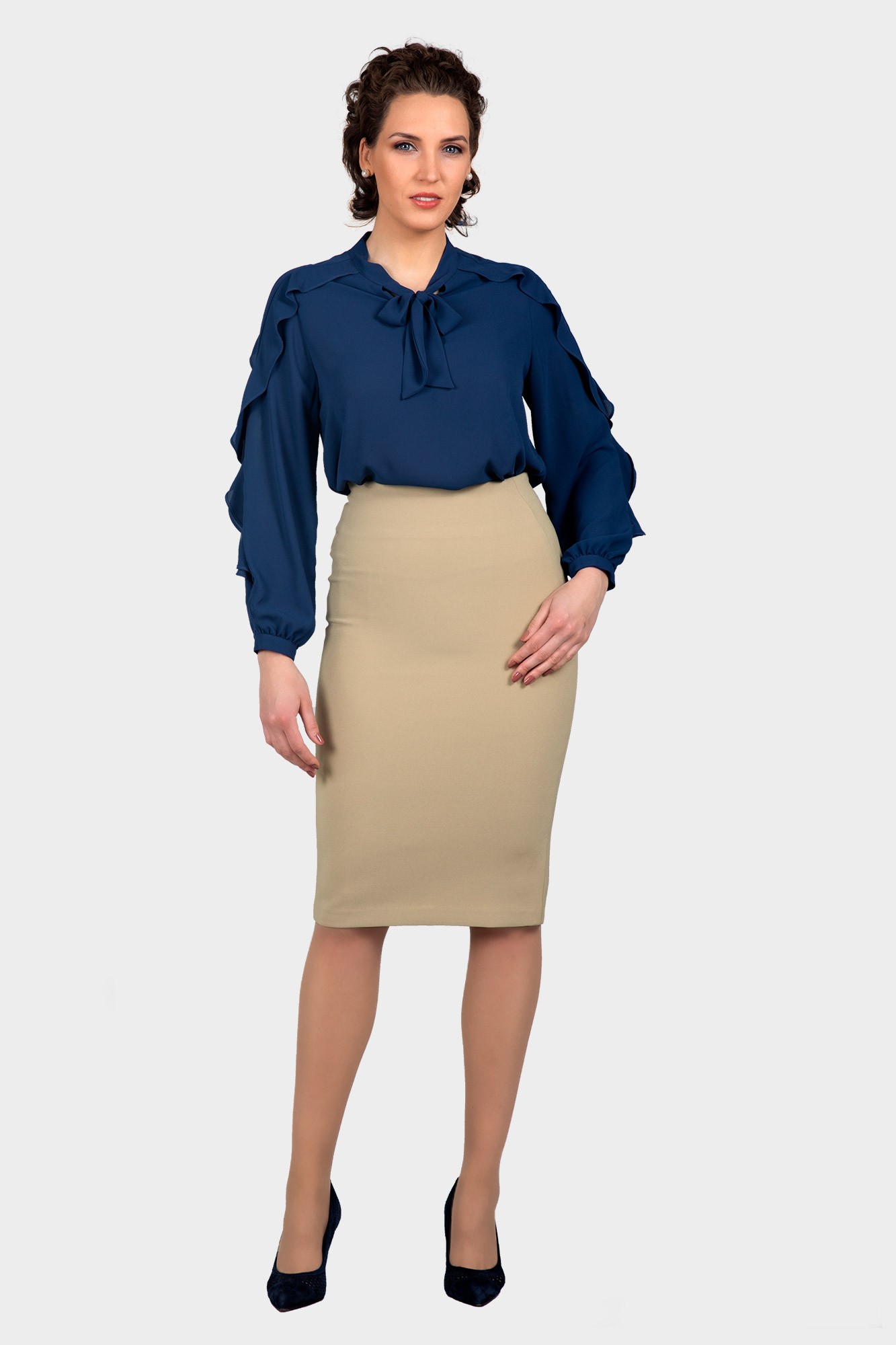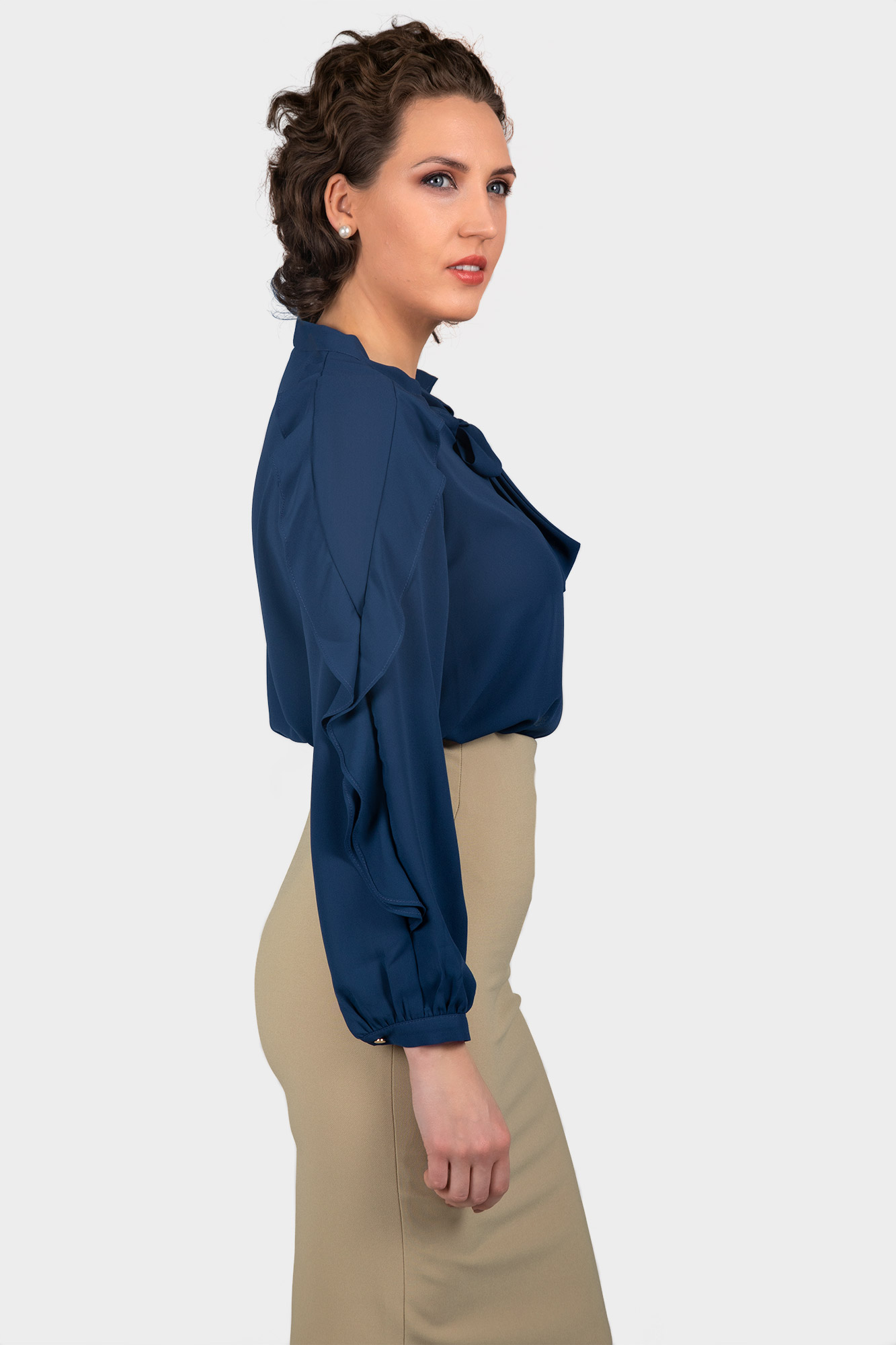 This blouse has a gorgeous style with a ruffle on the sleeve line. Sleeve ruffle with a captivating silhouette, cuffed at the sleeves for a smart finish. Also features a versatile neck tie.
